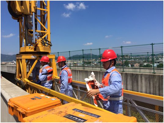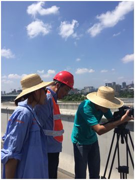 盡管如此,檢測(cè)員們?nèi)匀蔽溲b,穿戴好反光背心、安全帽,佩戴上安全帶,頂著烈日在橋檢車(chē)上揮汗如雨地工作著。拍攝過(guò)程持續(xù)了1個(gè)多小時(shí),汗水濕透了我們的衣服又被太陽(yáng)曬干,但對(duì)于檢測(cè)員們而言,在這樣的天氣里工作不過(guò)是他們的常態(tài)。